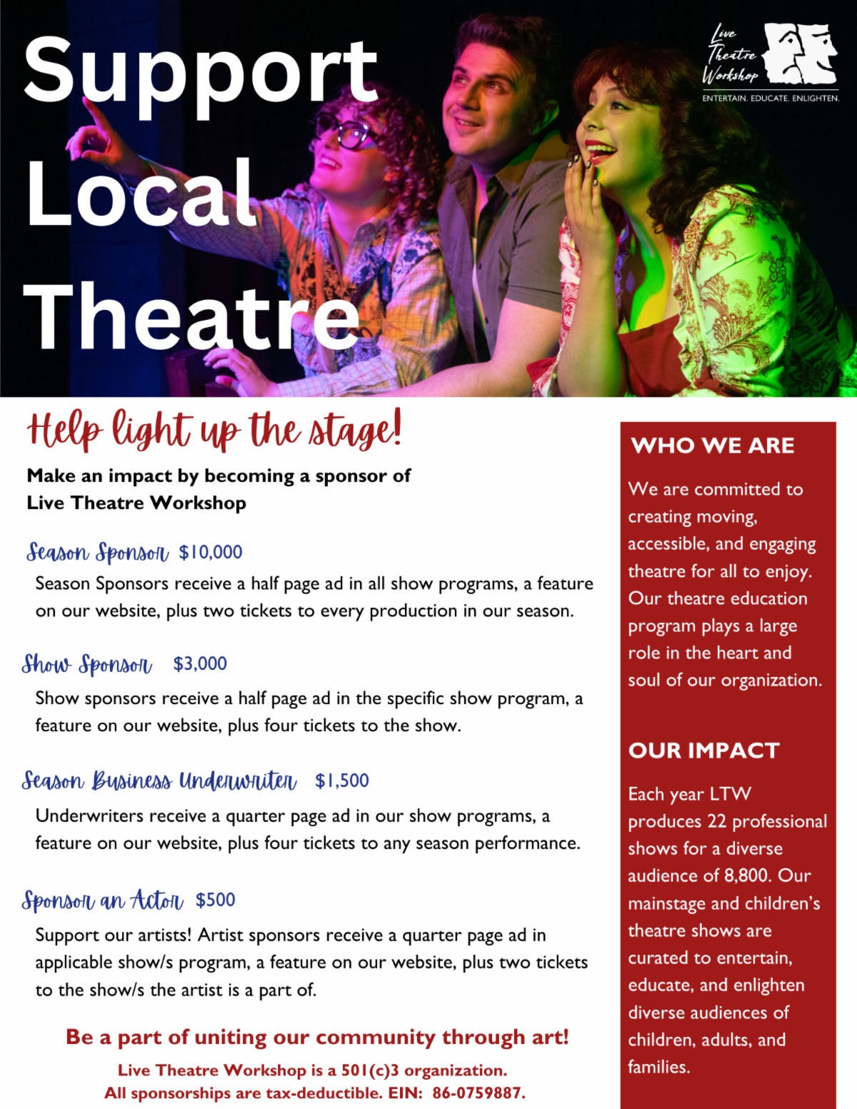 Choose from flexible options like 8 Show Full Season Package, 6 Show Package, 4 Show Package, Add-On Productions, Special Events, and more! (Find more information below or click here.)