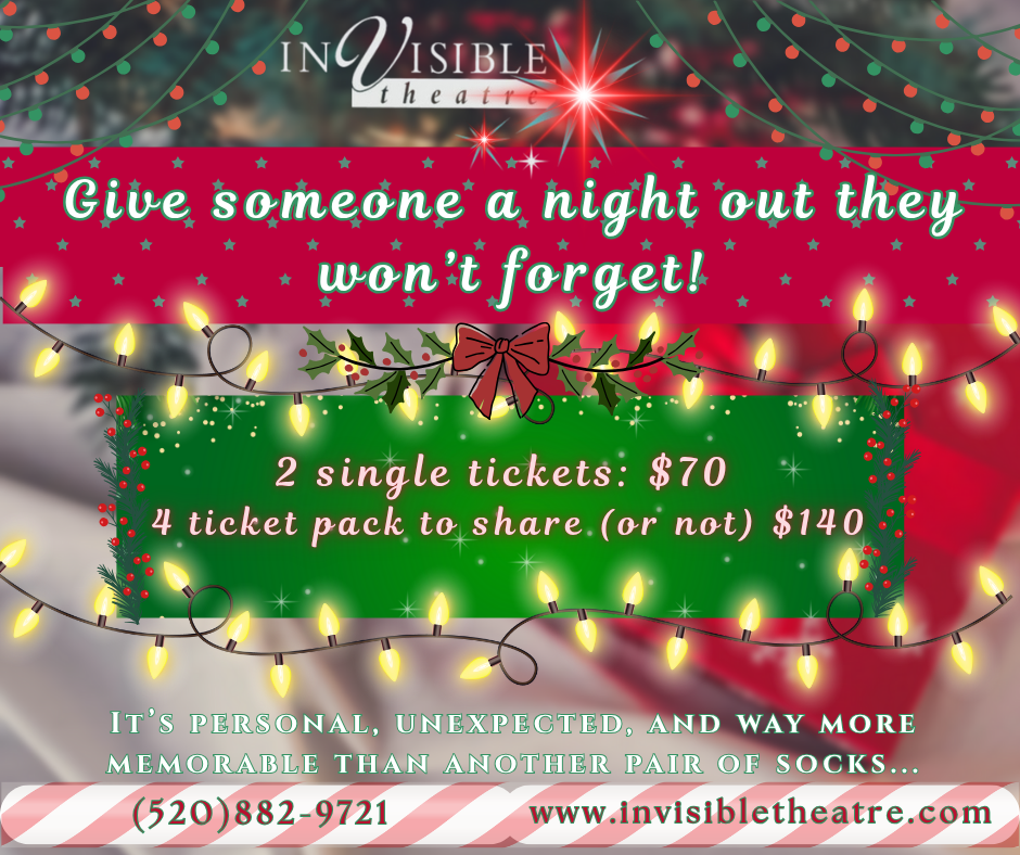 Looking for the perfect present? Share the magic of live performance with Invisible Theatre! This year, give your loved ones an experience they'll remember—2 single tickets for $70 (Savings of $20) or 4-ticket pack for $140 (Savings of $40) for even more memorable nights!